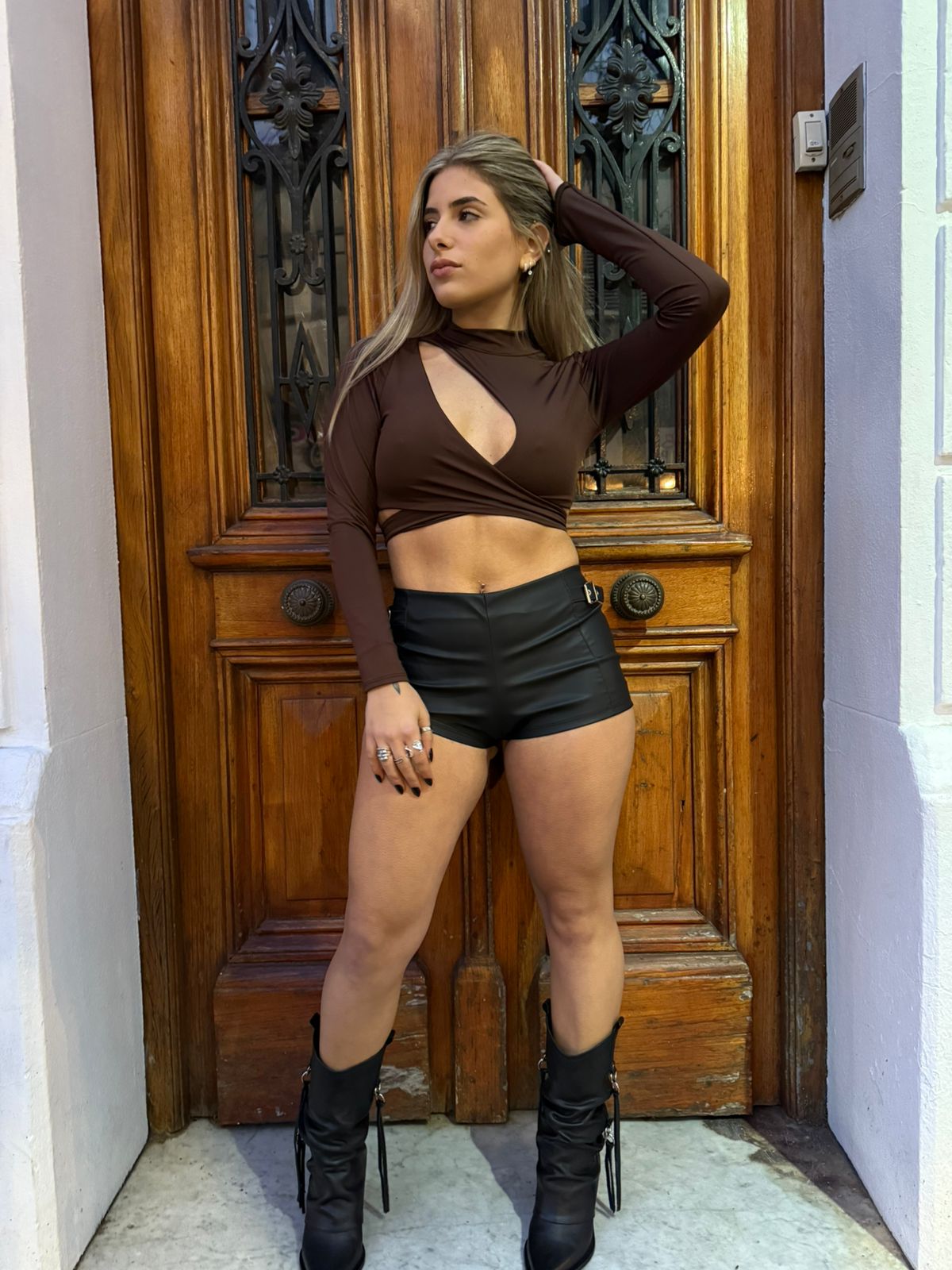 Mini short engomado. Modelo talle unico. Engomado con hebillas a los costados y cierre en la parte de atras. Elastizado, abarca entre un 36 y un 40.